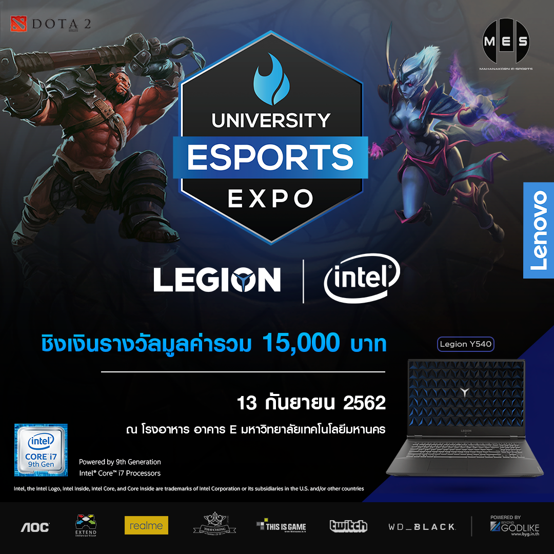 Lenovo Legion ผู้นำด้านอุปกรณ์ Gaming Gear ที่โดดเด่นด้วยคุณภาพ และดีไซน์ โดนใจเหล่าเกมเมอร์และนักแข่งอีสปอร์ต สนับสนุนการแข่งขันอีสปอร์ตสุดยิ่งใหญ่ระดับมหาวิทยาลัย ภายใต้ชื่องาน University ESPORT EXPO by Lenovo จัดการแข่งขันเกม Dota 2 เกมแนว multiplayer online battle arena (MOBA) หรือที่รู้จักกันในรูปแบบเกมทำลายป้อม เพื่อชิงเงินรางวัลรวมถึง 150,000 บาท
