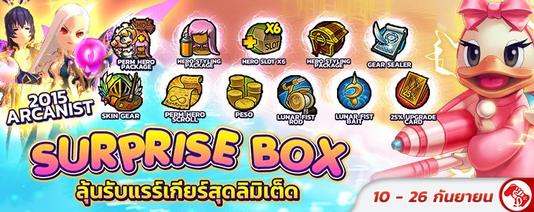 มาแล้ว ! กับแรร์เกียร์สุดลิมิเต็ดที่ชาว Lost Saga ใครๆ ก็อยากได้ กับเซ็ต “2015 Arcanist” เกียร์เด็ดที่โดดเด่นด้วยความสวยงามสุดอลังการ โดยจะถูกนำมาบรรจไว้ใน Surprise Box พร้อมไอเทมอื่นๆ อีกมากมายให้เพื่อนๆ ได้เปิดลุ้นรับกัน ในราคาสุดคุ้ม เพียง 3,000 Cash เท่านั้น !