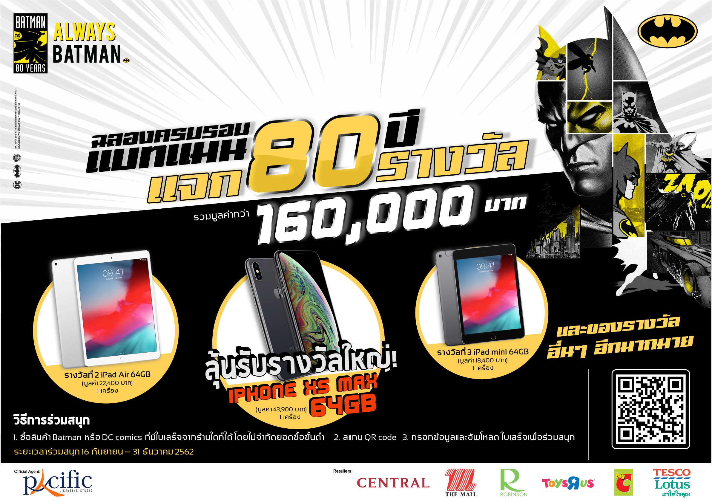 พิเศษสุดๆ สำหรับแฟนชาวไทย เตรียมเฮกับกิจกรรมฉลองแบทแมนครบรอบ 80 ปี ในเมืองไทย Batman 80th Anniversary Sweepstake แจกให้จุก 80 รางวัล รวมมูลค่ากว่า 160,000 บาท เพียงซื้อสินค้าแบทแมน หรือ DC comics ที่มีใบเสร็จจากร้านใดก็ได้ใน ห้างสรรพสินค้าเซ็นทรัล เดอะมอลล์ โรบินสัน ทอยส์อาร์อัส บิ๊กซี และเทสโก้โลตัส แบบไม่จำกัดยอดขั้นต่ำ จากนั้นแสกน QR Code หรือเข้าเว็บไซต์ http://th.scan-do.com/batman80th กรอกข้อมูลและอัพโหลดใบเสร็จ ง่ายๆ แค่นี้ ก็รอลุ้นรางวัลจากแบทแมนมากมาย อาทิ iPhoneXS Max, iPad Air, iPad mini และของรางวัลอื่นๆ อีกมากมาย