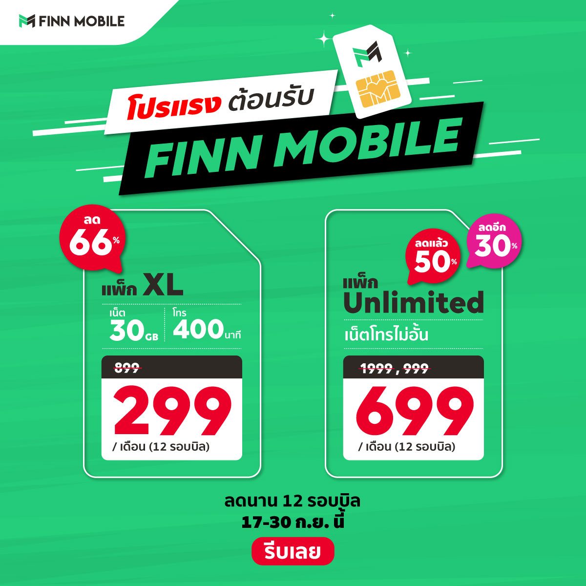 “ต้อนรับทุกคนสู่ครอบครัว FINN MOBILE” พิเศษสุด! ลดราคาแพ็กเกจ XL ถึง 66% เหลือเพียง 299 บาท และ Unlimited ลดแล้ว 50% ลดเพิ่มให้อีก 30% เหลือเพียง 699 บาท ถึงสิ้นเดือน ก.ย. นี้เท่านั้น! ลูกค้าปัจจุบันก็เปลี่ยนมาใช้แพ็กเกจนี้ได้ หากไม่ได้ใช้ 2 แพ็กเกจดังกล่าว