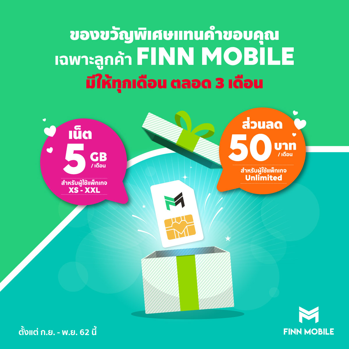 FINN MOBILE ยังเตรียมของขวัญแทนคำขอบคุณให้ลูกค้าปัจจุบันได้ฟินทุกเดือน ต่อเนื่องกันนาน 3 เดือน สำหรับลูกค้าที่ใช้แพ็กเกจ XS, S, M, L, XL, XXL รับเน็ตฟรีเดือนละ 5 GB ส่วนลูกค้าแพ็กเกจ Unlimited รับส่วนลดแพ็กเกจเดือนละ 50 บาท รับของขวัญได้ง่ายๆ ทุกเดือน เป็นเวลานาน 3 เดือน เพียงเข้าไปที่แอปพลิเคชัน FINN MOBILE แล้วกดรับของขวัญที่แถบ Lucky Rewards เท่านี้ก็ได้สนุกกับโลกโซเชี่ยลหรือได้เซฟเงินในกระเป๋ามากขึ้นทันที