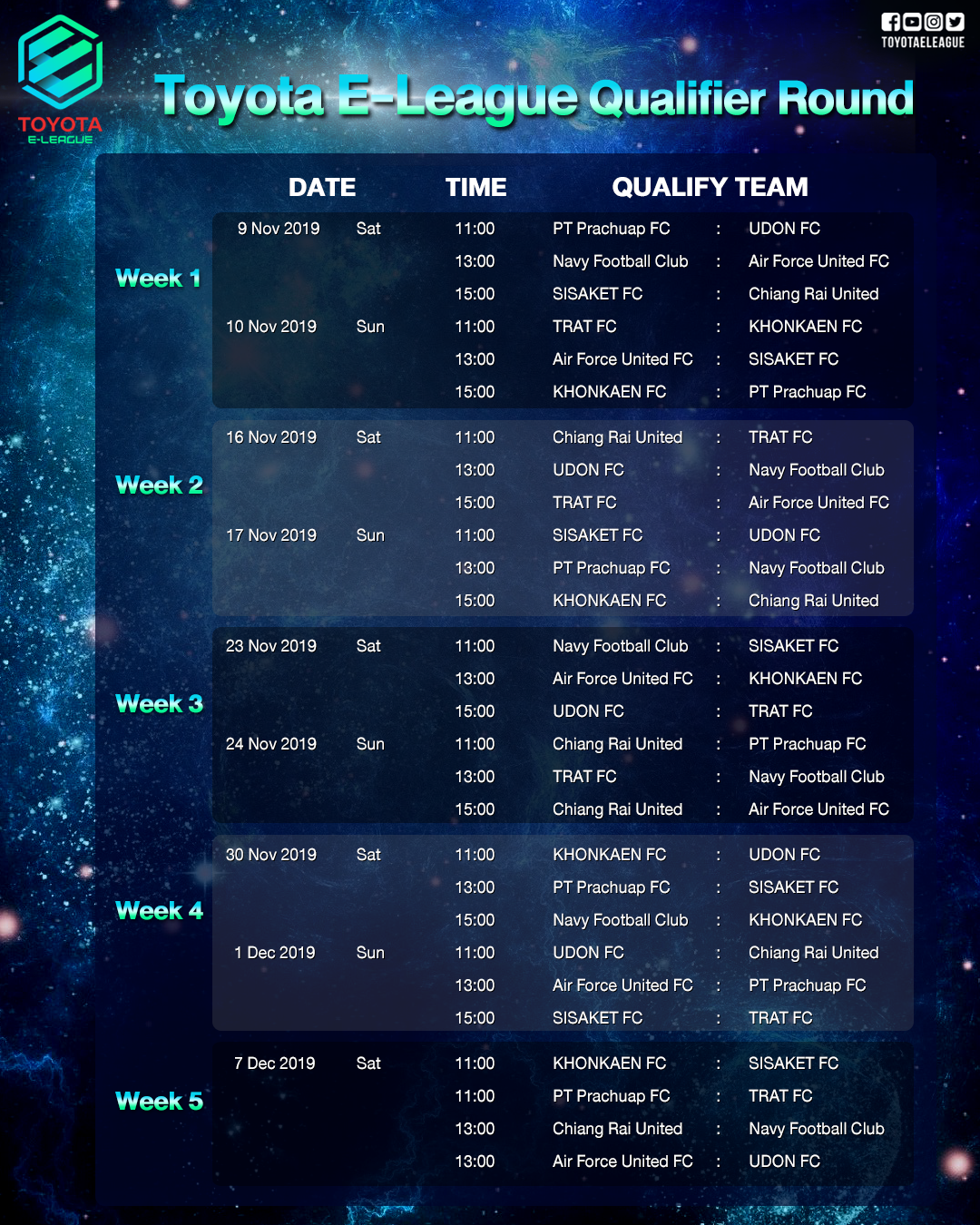 กลับมาอีกครั้งกับ TOYOTA E-LEAGUE SEASON 2020 รอบคัดเลือก ซึ่งเป็นการร่วมมือระหว่างสมาคมกีฬาฟุตบอลแห่งประเทศไทย ในพระบรมราชูปถัมภ์ บริษัท โตโยต้า มอเตอร์ ประเทศไทย จำกัด และธนาคารออมสิน อีกครั้ง โดยร่วมกันพัฒนาวงการอีสปอร์ต และนักกีฬาอีสปอร์ตเกมฟุตบอลของประเทศ เพื่อไปสู่การแข่งขันในรายการระดับโลก