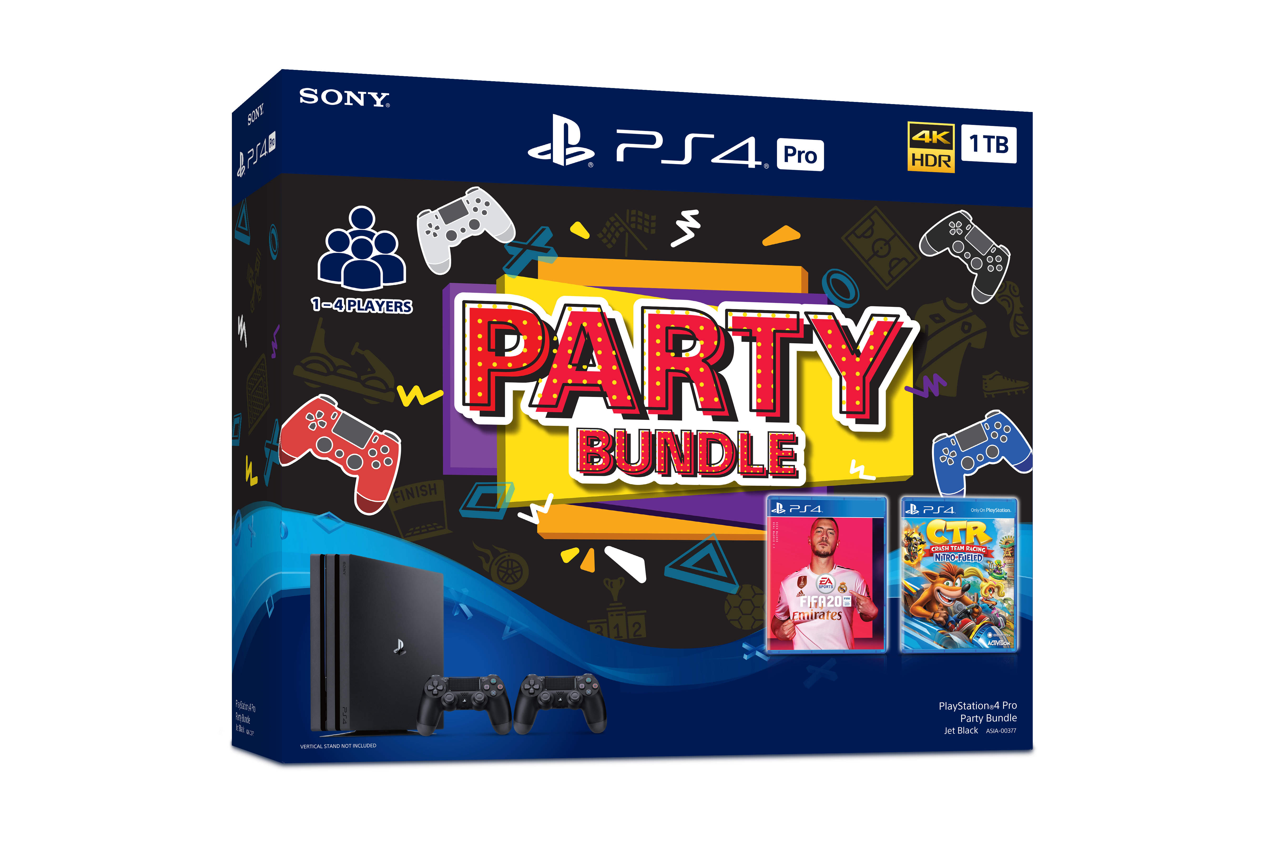 “PlayStation®4 Pro Party Bundle” บรรจุมาในกล่องสีดำสวยงาม นำเสนอในราคา 14,990 บาท ประกอบด้วยเครื่องเกมคอนโซล PS4™Pro สี Jet Black ความจุ 1TB, คอนโทรลเลอร์ไร้สาย DUALSHOCK®4 สี Jet Black จำนวน 2 อัน พร้อมด้วยเกม EA SPORTS™ FIFA 20 (แผ่นดิสก์) และ Crash™ Team Racing Nitro-Fueled (แผ่นดิสก์) และคูปองขยายเวลารับประกันอีก 1 ปี
