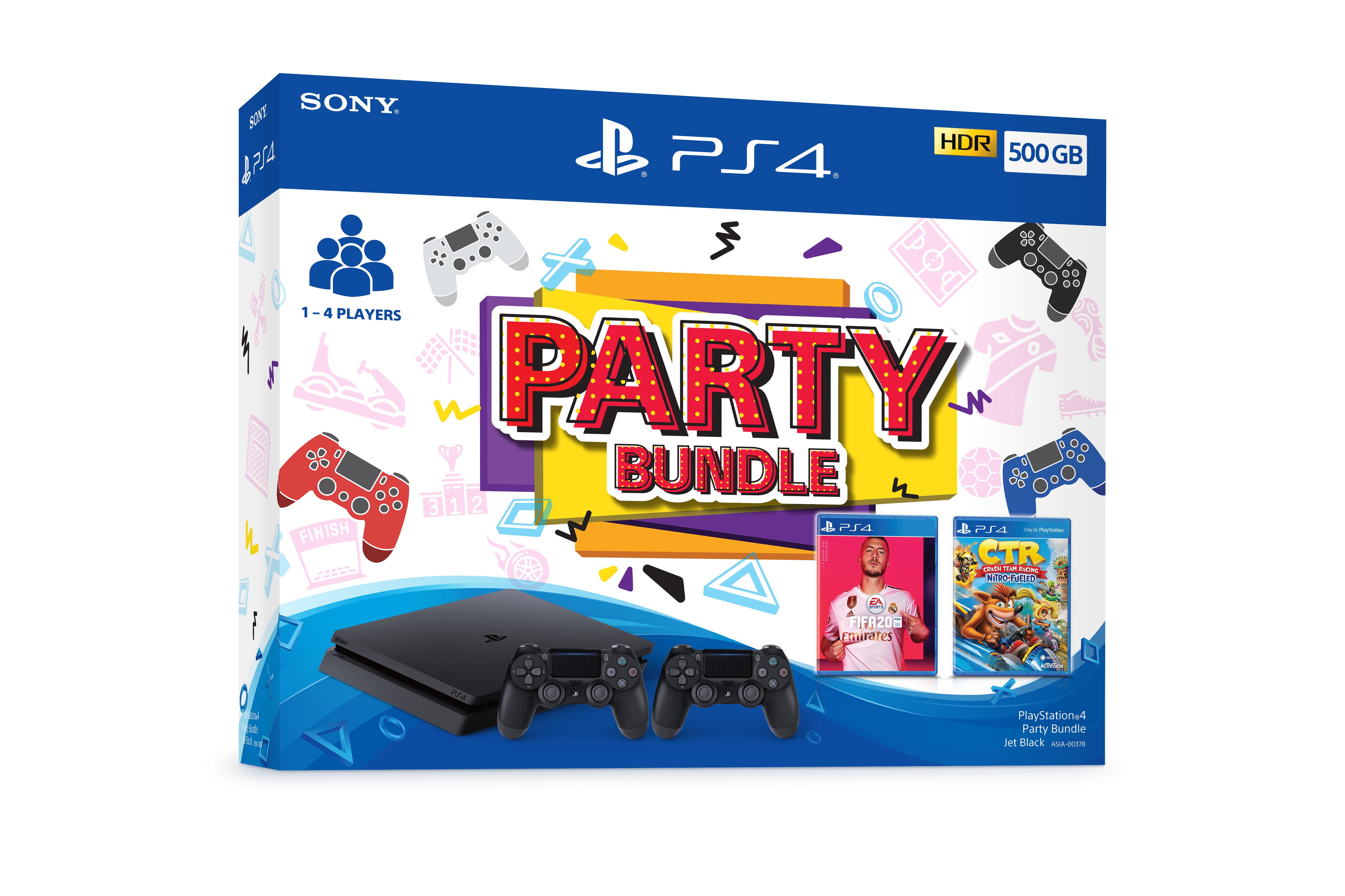 “PlayStation®4 Party Bundle” บรรจุมาในกล่องสีขาว นำเสนอในราคา 11,990 บาท ประกอบด้วยเครื่องเกมคอนโซล PS4™ สี Jet Black ความจุ 500GB, คอนโทรลเลอร์ไร้สาย DUALSHOCK®4 สี Jet Black จำนวน 2 อัน พร้อมด้วย EA SPORTS™ FIFA 20 (แผ่นดิสก์) และ Crash™ Team Racing Nitro-Fueled (แผ่นดิสก์) และคูปองขยายเวลารับประกันอีก 1 ปี