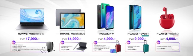 โดย HUAWEI MateBook D15 จะวางจำหน่าย ผ่านทางเว็บไซต์เจดี เซ็นทรัล (JD Central) ที่ www.jd.co.th และหัวเว่ย แบรนด์ชอปที่ร่วมรายการ สำหรับ HUAWEI MediaPad M6, HUAWEI Y7p ,HUAWEI nova 5T สี Crush Green และ HUAWEI FreeBuds 3 Red Edition จะวางจำหน่ายจะวางจำหน่ายผ่านทางหัวเว่ย แบรนด์ชอปและร้านตัวแทนจำหน่ายที่ร่วมรายการทั่วประเทศ