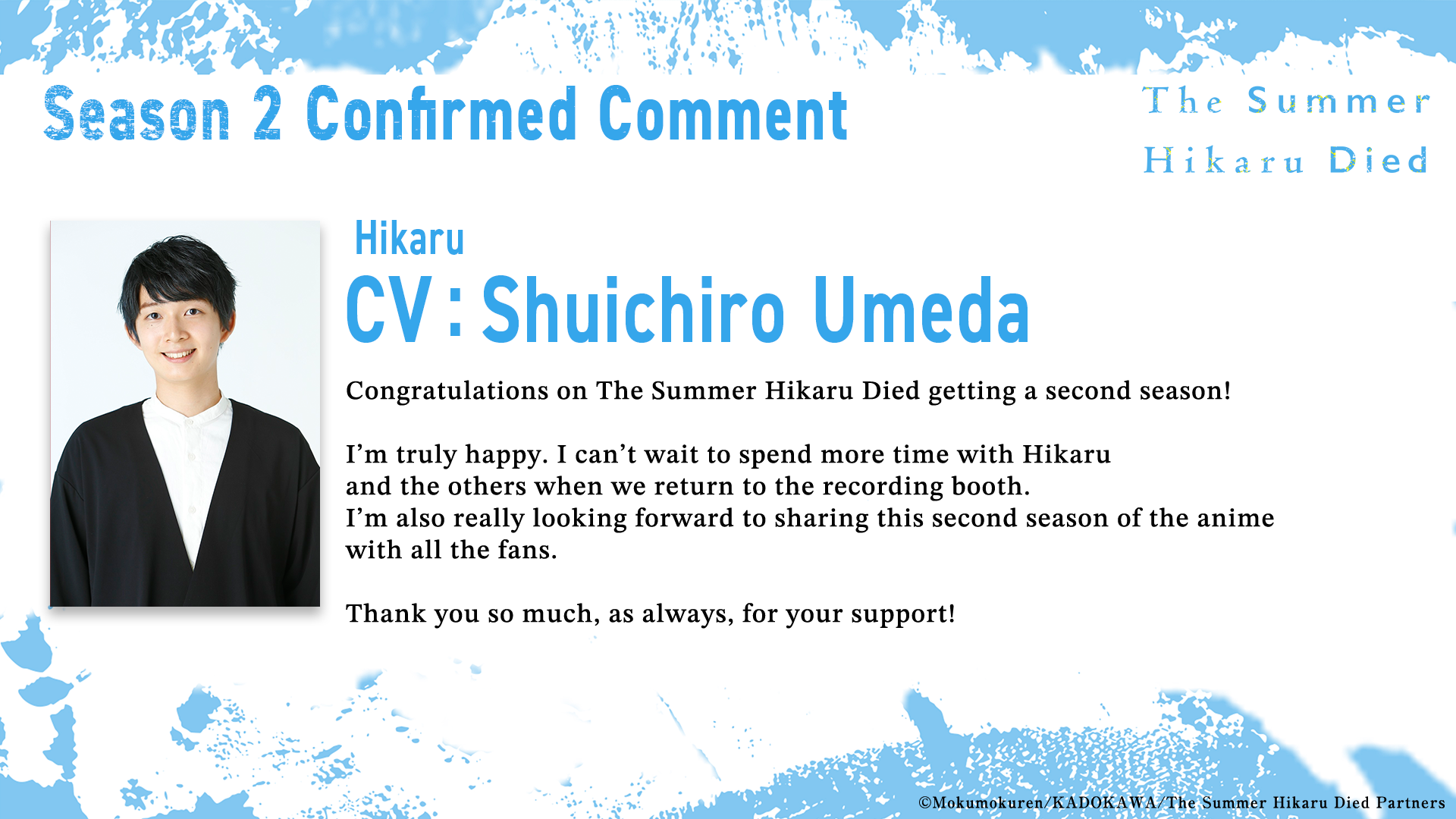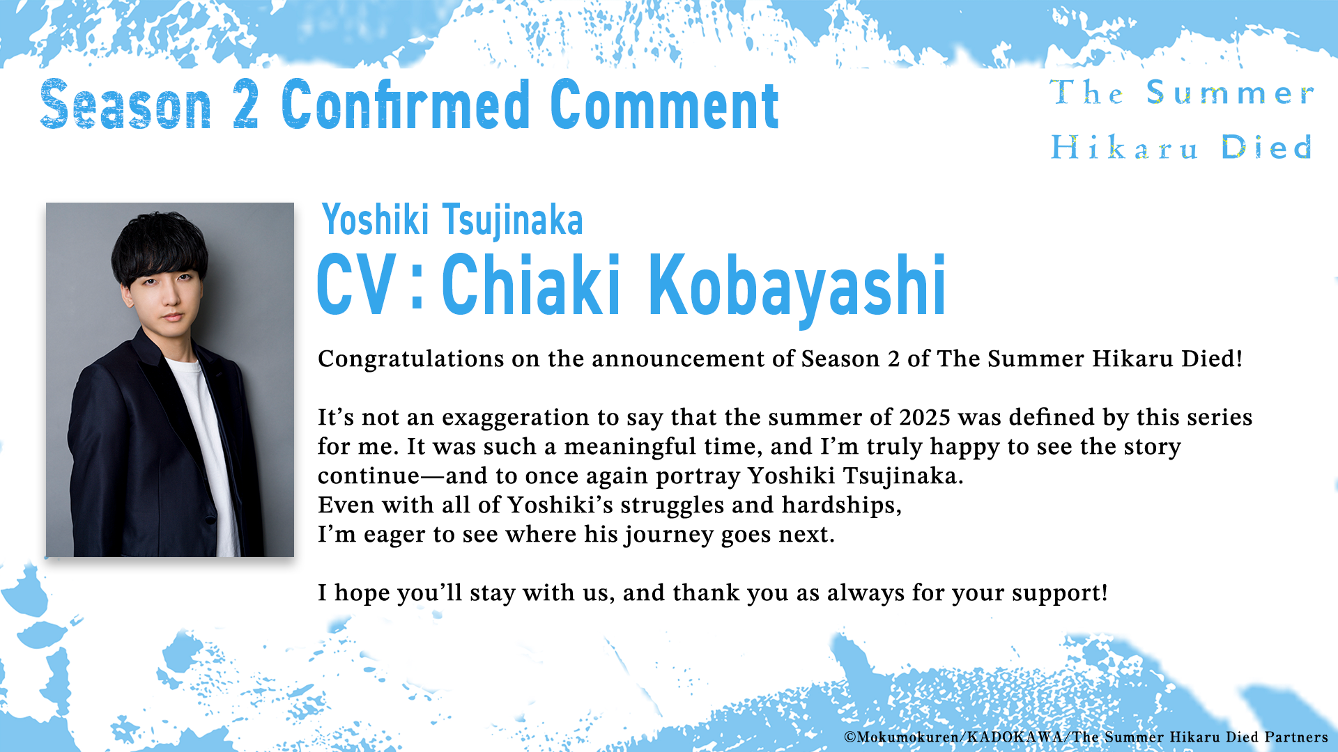 To mark the announcement of Season 2, we are pleased to share special illustrations from the original manga’s creator Mokumokuren and character designer Yuichi Takahashi as well as comments from Chiaki Kobayashi (voice of Yoshiki Tsujinaka)and Shuichiro Umeda (voice of Hikaru). Fans can look forward to the continuation of this series, which took the summer of 2025 by storm.
