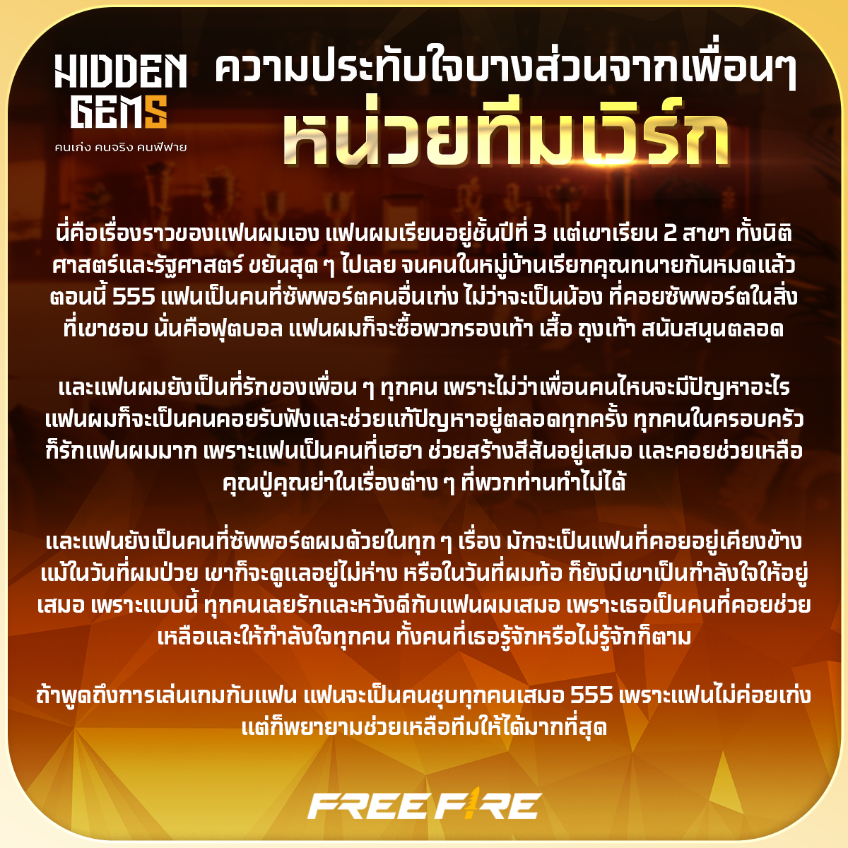 หน่วยดาเมจ (Limitless Heart) ผู้สร้างสรรค์และแบ่งปันความสุขอย่างไม่หยุดยั้ง: เรื่องราวของ “จ้อน” หรือที่รู้จักกันในชื่อ “ยูโฟร์แครี่” ผู้สร้างแรงบันดาลใจและมอบความสนุกให้ผู้เล่นมากมายผ่านโหมด Craftland ซึ่งเป็นโหมดสร้างแผนที่ในเกม Free Fire โดยเริ่มต้นจากการสร้างแผนที่เล็ก ๆ เพื่อความเพลิดเพลิน และพัฒนาด้วยความตั้งใจและความคิดสร้างสรรค์อย่างต่อเนื่องโดยให้ความสำคัญกับการสื่อสารและรับฟังข้อเสนอจากผู้เล่น จน Craftland กลายเป็นชุมชนย่อยที่ทุกคนร่วมแบ่งปันความสุข สิ่งนี้พิสูจน์ว่า “การลงมือทำอย่างสม่ำเสมอ สามารถเติบโตเป็นสิ่งที่มีคุณค่าต่อตนเองและสังคมเกมได้จริง”