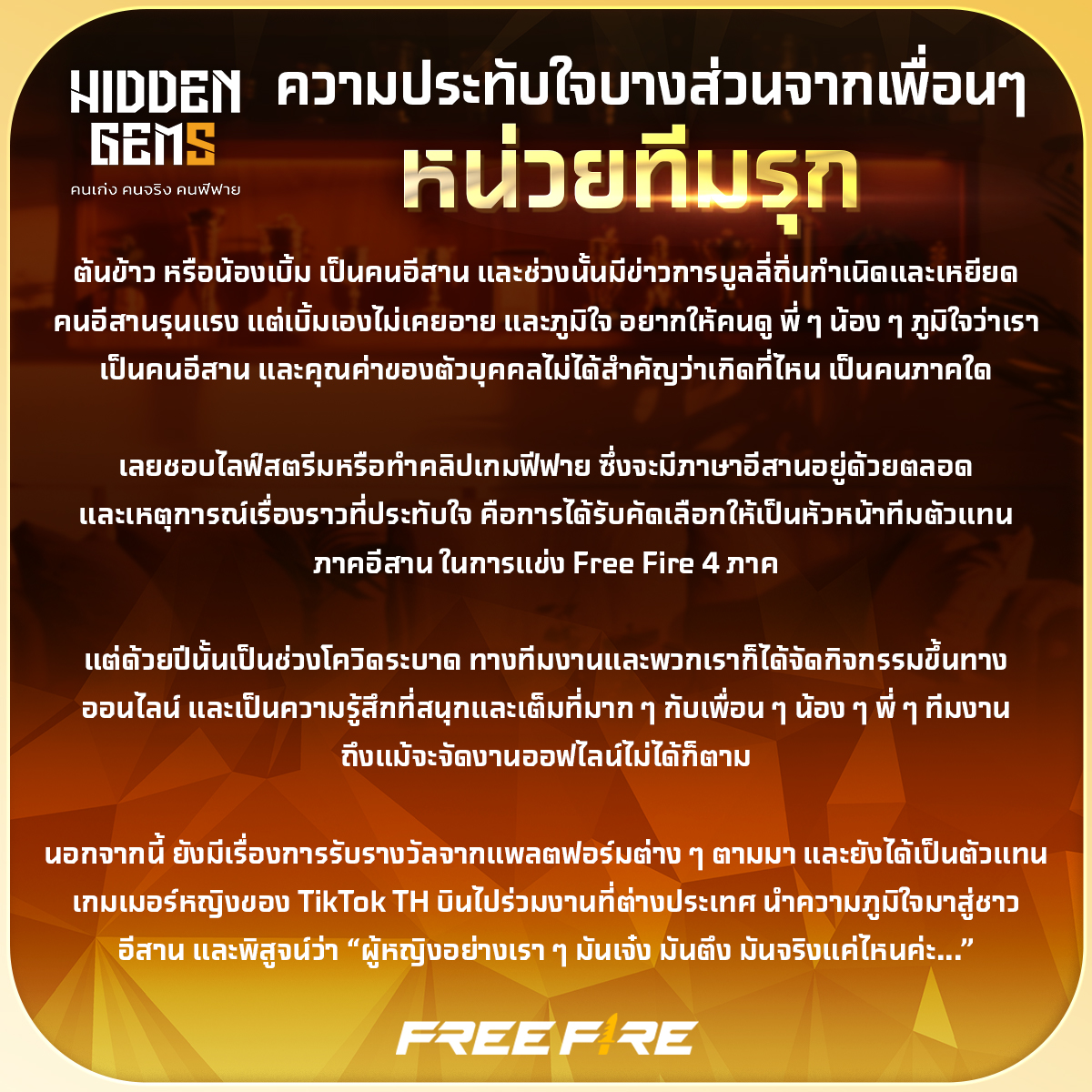 Free Fire เกมแบทเทิลรอยัลบนมือถือยอดนิยมระดับโลกซึ่งพัฒนาโดยการีนา (Garena) และเปิดให้บริการในประเทศไทยมาอย่างยาวนานกว่า 8 ปี เดินหน้าสานต่อพันธกิจในการสร้างสังคมเกมที่เต็มไปด้วยพลังบวกและแรงบันดาลใจ ผ่านแคมเปญ “Hidden Gems: คนเก่ง คนจริง คนฟีฟาย” มุ่งเฉลิมฉลองผู้เล่นไทยที่ไม่เพียงเป็นผู้เล่นตัวยงของเกม Free Fire แต่ยังเปล่งประกายคุณค่าของตัวเองในแง่มุมต่าง ๆ